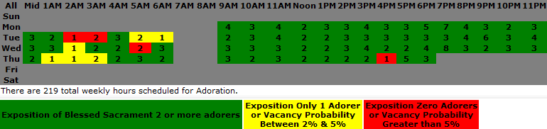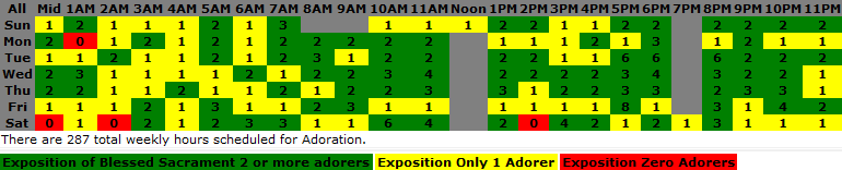 Automated Color-Coded Chapel Shedule Charts show EVERYONE the status and needs of the Adoration Chapel. Now everyone in the parish can know what the chapel needs, not just the chapel leaders after often exhaustive analysis of hard-to-read, hand-written log sheets that numerous hourly captains eventually get around to trying to figure out. The examples below come from three chapels using the system to meet their needs. The database creates a color-coded Chapel Shedule Chart that shows how many scheduled adorers there are for each hour and, depending upon settings, what the "health" status of each hour is. The idea is the everyone can see read and yellow hours need the help of more scheduled adorers. The colors can be determined in a number of ways and are especially useful the attendance features of the system are taken are used.