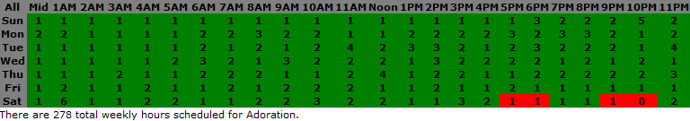 Chapel Chart Example 3 has opted to keep hours green even if only 1 adorer. In this example Sat 10PM is red with 0 adorers and the other three red hours with 1 adorer indicate an attendance issue.