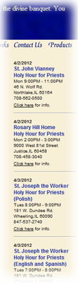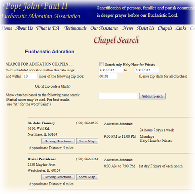 In addition, a chapel database can be used for more detailed devotions, like Chicago's "Holy Hour for Priests" which are scheduled throughtout the diocese throughout the month.
