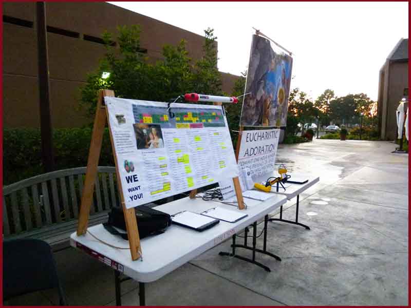 The blurred tearoff of the Signup Sunday poster form shows how things work. Using the poster thoughout the Sunday signup process parishioners look at the needs and sign up for hours. Various explanations are given to them. Often the homily incorporates Eucharistic Adoration. Adorer signup. They fill out Signup forms such as those available on this website's collaberation page, those signin forms are entered into the Adoration Servants system, and the adoration is stronger by new adorers.