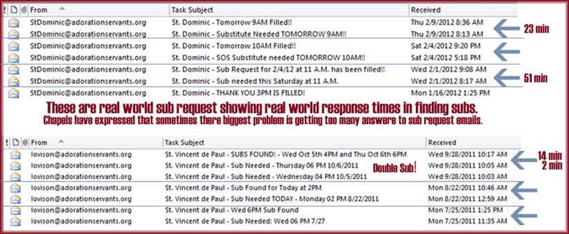 Depending on the maturity of the chapel, as well as the experience and changing pressures upon the scheduled adorers, Chapels can be left vacant during exposition regardless of phone trees and other antiquated type methods. The chapel leaders themselves often bear the brunt of hour substitution which can cause needless stress on chapel personnel. Our on-demand sub request emails allow subs to be found within minutes, as the examples below show. When used in conjuction with other chapel policies and procedures, the pressure of finding subs and keeping adores completely informed is greatly relieved.